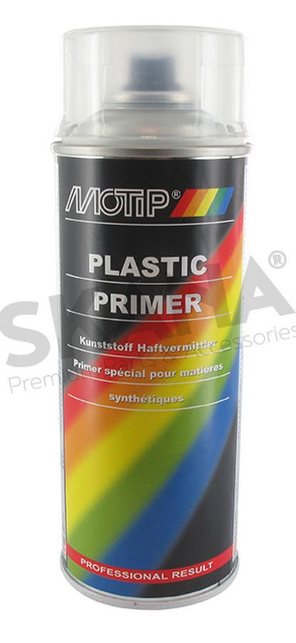 Spray transparent plastic primer for durable painting of hard plastics. Can be used on polyurethane (PUR), polystyrene (PS), polyamide (PA), propylene rubber (EPDM), ABS, glass fiber reinforced plastic (GRP) and hard PVC. 400ml.