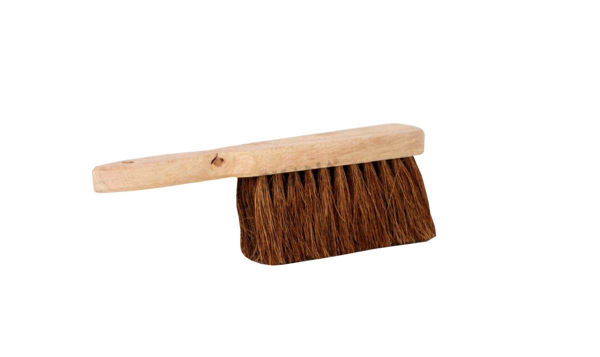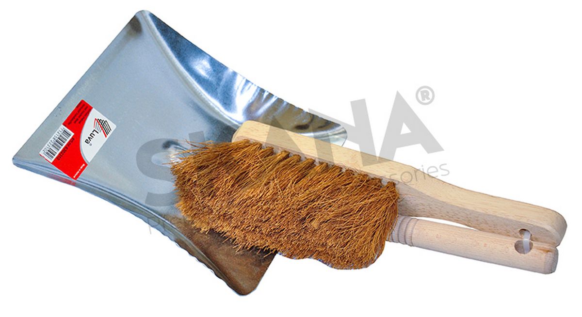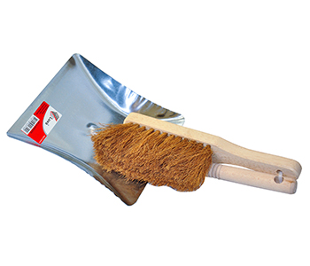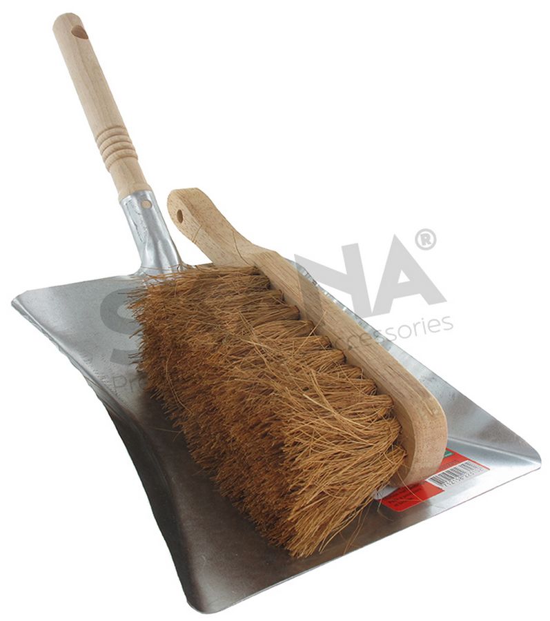 Set of metal dustpan and hand brush with wooden handle and coconut hair.