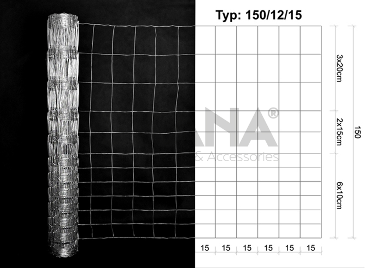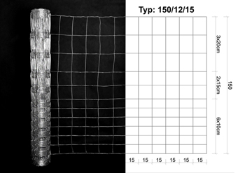 Wildlife, forestry or agricultural fence 150/12/15. Height 150cm. 50m roll. Galvanized steel wire (vertical 2.0mm / horizontal 1.6mm). 6 rows with 10 x 15cm meshes / 2 rows with 15 x 15cm meshes / 3 rows with 20 x 15cm meshes.