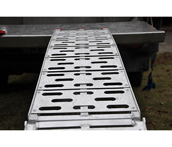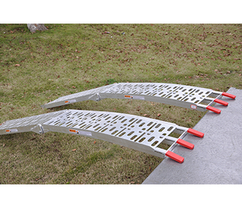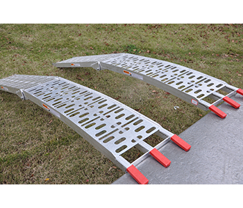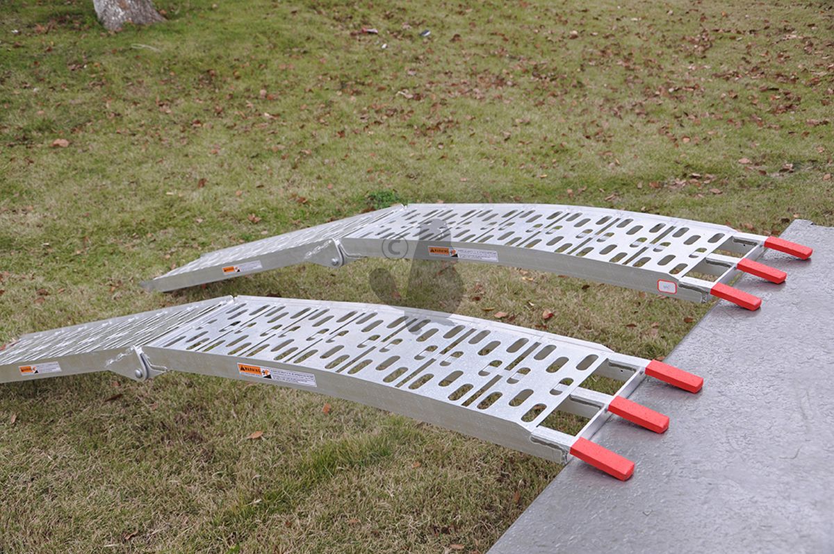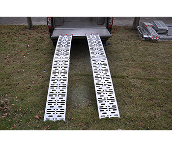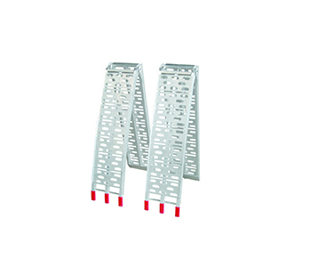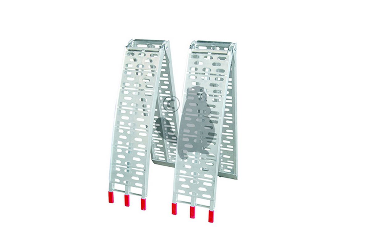 Pair foldable aluminium ramps. Length 225 cm, width 29 cm. Capacity 600/kg/pair. The perforated plates provide extra grip. Safety straps included.