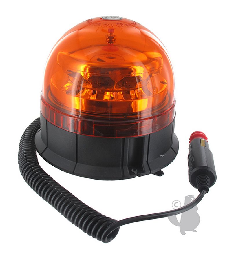 LED warning-/flash beacon (3 positions: 2 flash + 1 rotary), 10-30V - 36W, orange, with magnetic base and 2,5 m spiral cord. IP67 (dust- and immersion tight). Homologation for use on public roads R65.