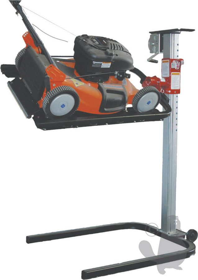 Professional lift for mowers, tillers, aerators, etc. Table rotates 360°. Easy to maneuver with transport wheels. Perfect access to machine, for repair and maintenance jobs. Manual winch. Max : 115 kg. Height max : 122 cm. With 2 safety straps.
