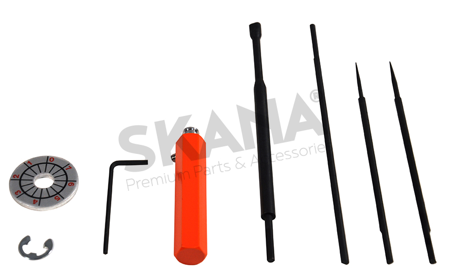 ECHO® and SHINDAIWA® carburator adjustment set, contains a holder, 3 specific adjustment rods and an adjustment tool.