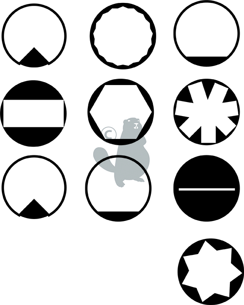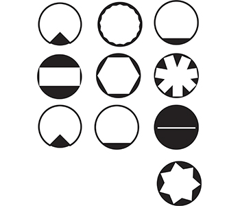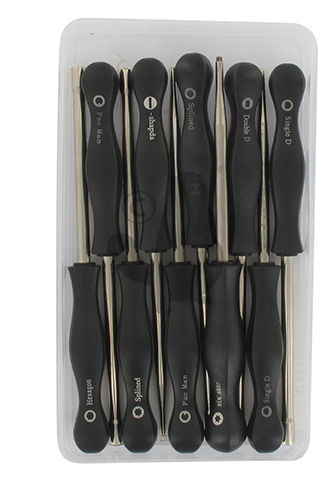 Set of 10 regulating screwdrivers for carburetors wiht 2 corner shapes, 2 star shapes, a hexagonal shape, a torx shape, 2 D shapes, a double D shape and a flat shape.