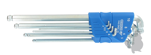 8-pcs hexagon Allen key set for in-hex screws, with double ball end. Contains 8 keys with sizes: 2 - 2,5 - 3 - 4 - 5 - 6 - 8 - 10 mm.
