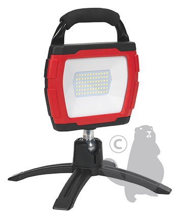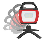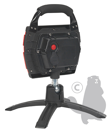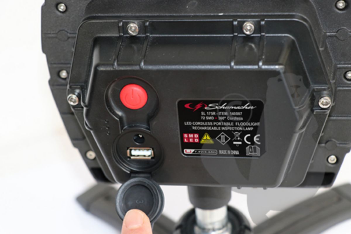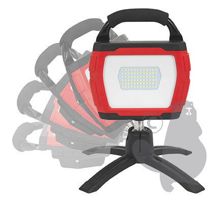 Portable worklight with rechargeable Li-ion battery 7,4 V, 4400 mAh. Lumen output of 750 Lm, 1500 Lm and 3000 Lm. Style ABS and aluminum housing. Folding design with LED Battery Level Indicator. USB port of 5 V 2,1 A max. Includes wall charger. Run time of 5 hrs, 2 hrs 30 min and 1 hrs 20 min depending of used lumen output. IP65 rated. CETEOR by SCHUMACHER®.