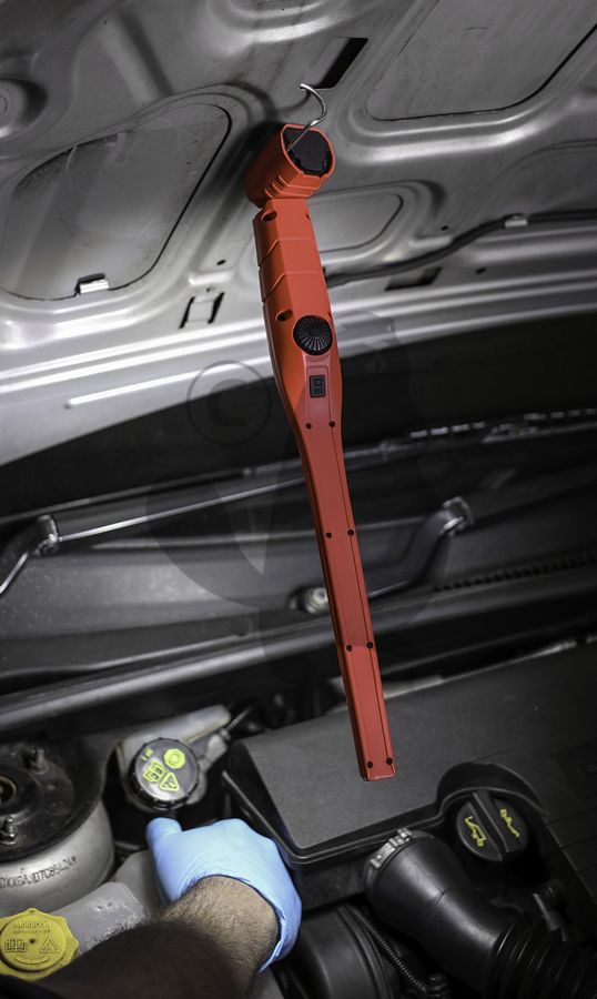 LED work light and torch with magnetic base from LED CETEOR by SCHUMACHER® SLIM 360°, rotary power selector from 0 to 600 Lumens x 120 minutes (full power usage time)., power supply 2600 mAh rechargeable lithium battery. Soft touch rubberized casing. Unique ball joint enables 360° swivel and tilt function. Magnetic base and retractable hook. Micro USB charging cable included.