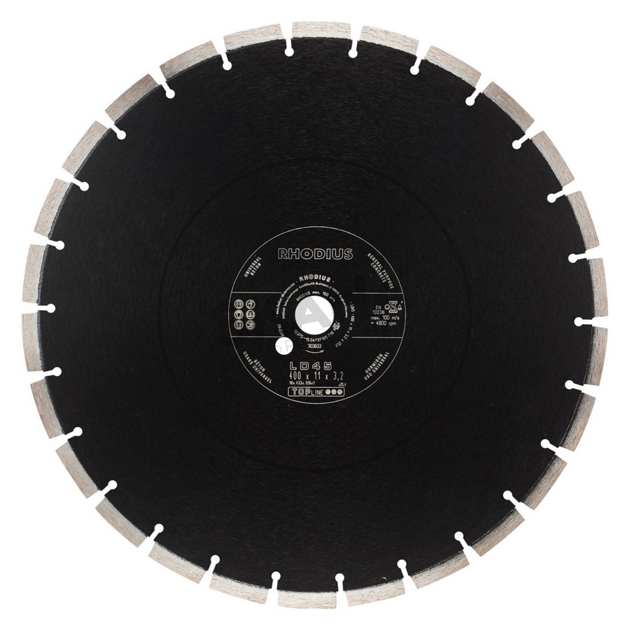 Top quality diamond cutting disc TOPLINE LD45. Dimensions 400 x 11,0 x 3,2, bore of 25,40. The 11 mm forged diamond segments of the LD45 allow higher performances at a high cutting speed and long lifetime compared to conventionally sintered segments. Noti