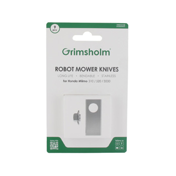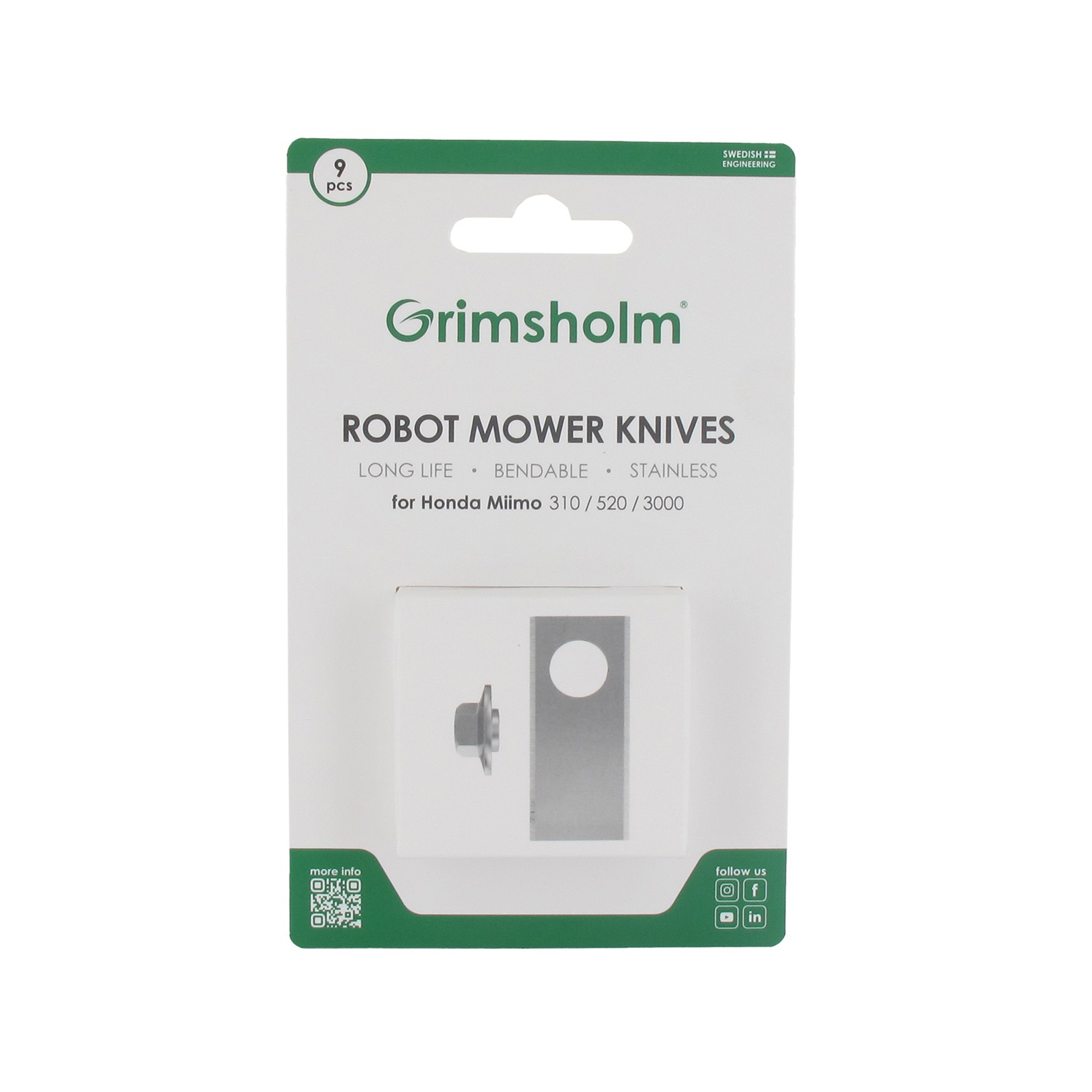 Blister containing 9 blades for robotic mowers HONDA MIIMO 300, MIIMO 310, MIIMO 500, MIIMO 520, HRM300 & HRM500. Replaces original: 06511-VP7-310, 72511-VP7-030, 72511-VP7-915, 06511-VP7-200MP, 72511VP7915, 06511VP7200MP.