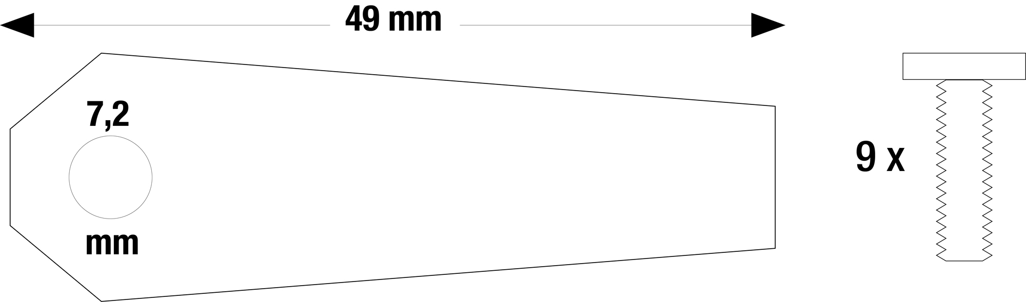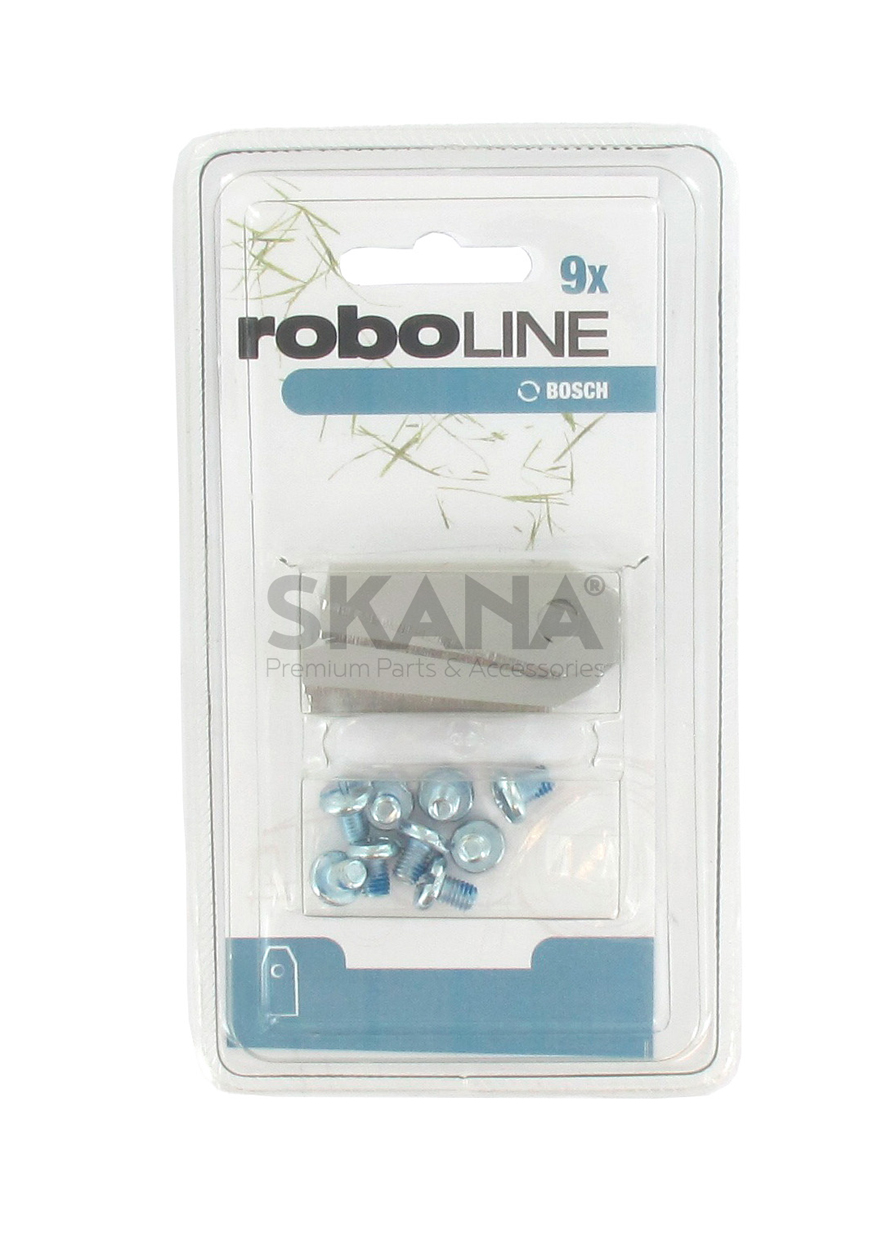 Blister containing 9 blades for BOSCH Indego 800, Indego 1000, Indego 1000 Connect, Indego 1100 Connect, Indego 1200 Connect, Indego 1300, Indego 1300 Connect robots. Replaces original F016800321 & F016104255.