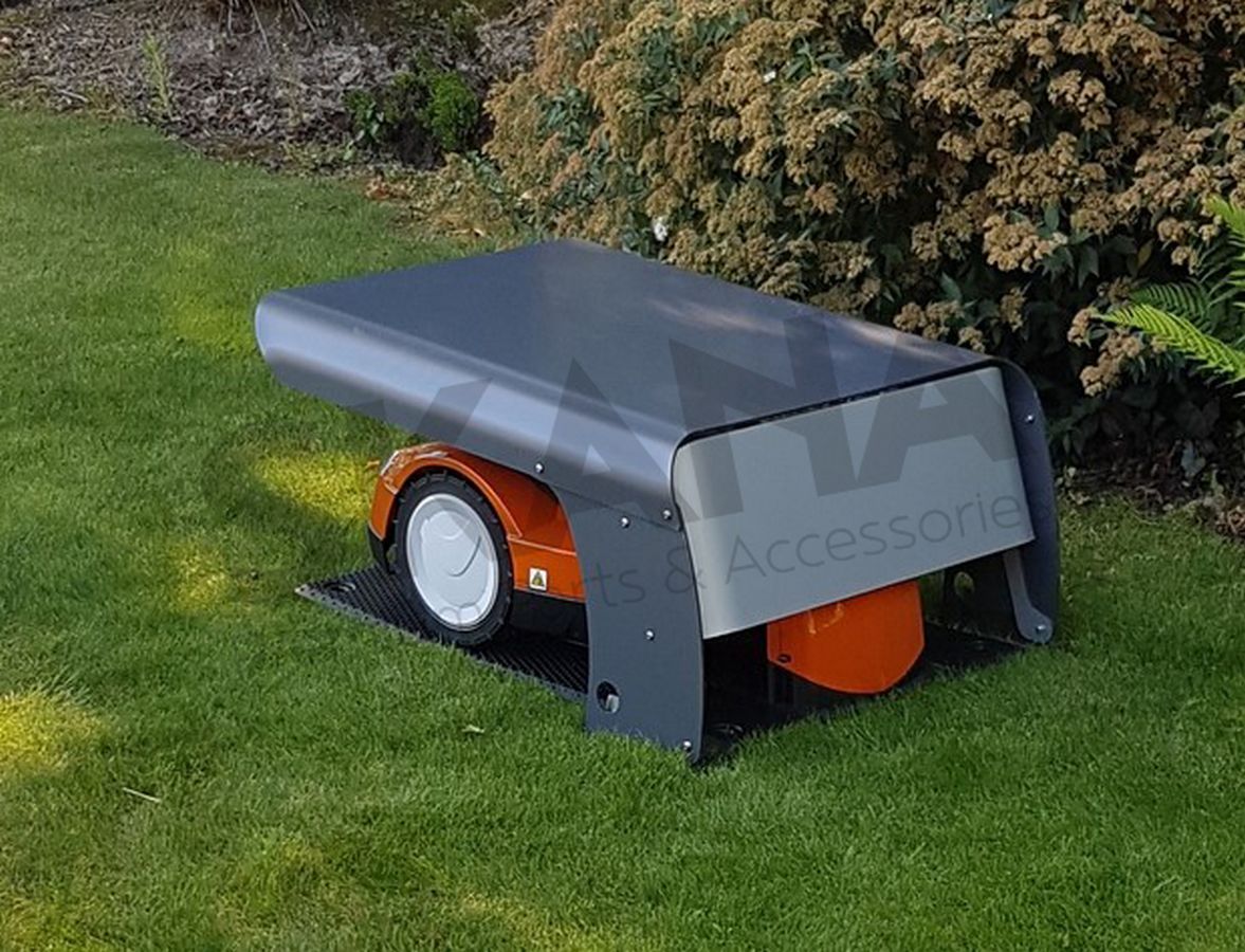 ROBOT PROTECT, garage for XL robots. Our garage protects your robotic lawnmower against effects of exposure to the sun rain and helps to ensure its longevity. The cover opens in two different positions allowing optimal access to the robot and the garage. Ideal for robots with rear and side exit. Easy access to base, station and robot. The elegant design will highlight your garden even more. Made in France. Specifications: Maximum robot height 39 cm - Length 86 x Width 65 x Height 40 cm - Weight 7 kg - INOX base, composite material covered by aluminium sheet (Alu-Dibond). Suitable for: BOSCH® INDEGO S+ 1000 1200, CUB CADET® XR3 5000, GARDENA® SILENO LIFE, HONDA® HRM 310 – 520 - 3000, HUSQVARNA® Automower 420 – 430X - 440, STIGA® 528 S – 530 SG, STIHL® RMI 632 – 632 C – 632 P – 632 PC…and many more!
