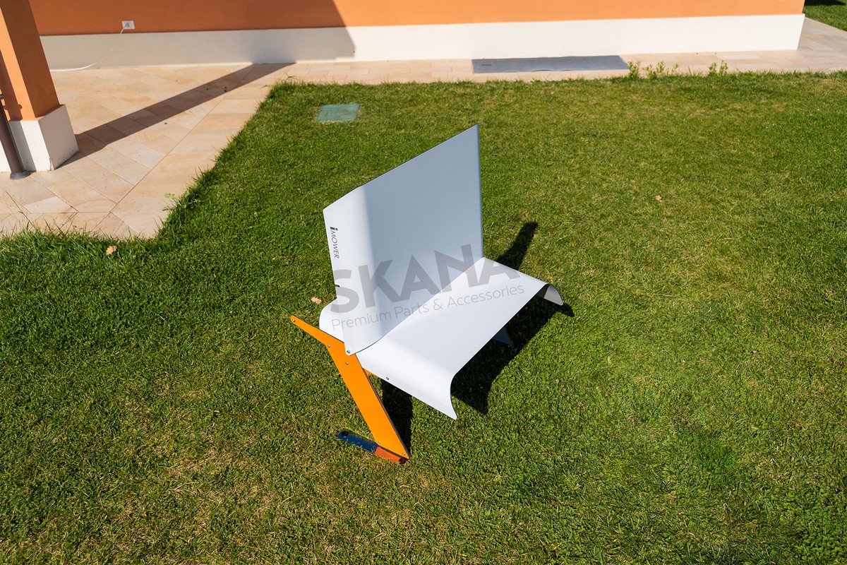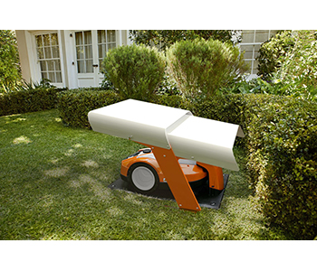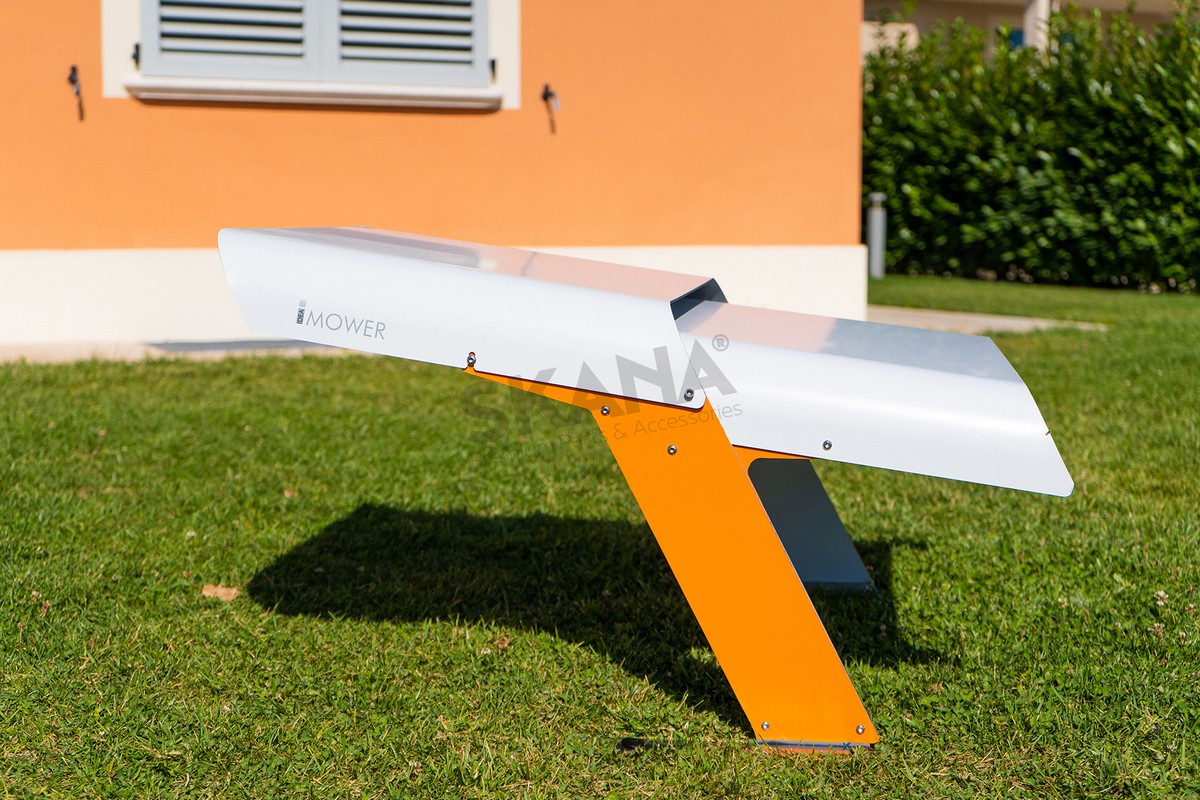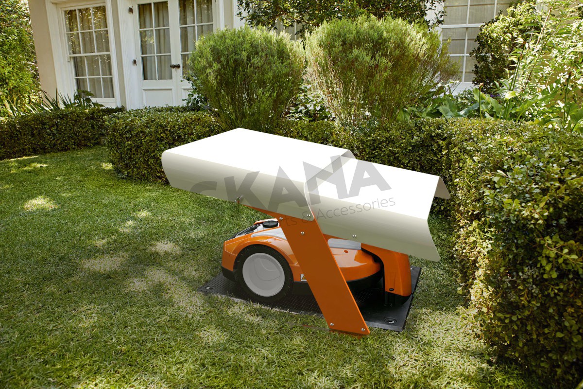 Robot shelter ONE 2.1 Custom style STIHL silver and orange. Sunroof. Made of 3 mm thick composite aluminum and stainless steel. Fixing to the ground independent of the charging station. Shocks received by the garage cannot damage the base or the robot. To be assembled by the customer. Dimensions: length: 840 mm, width: 720 mm, height: 400 mm. Ideal for STIHL iMow 422, 422P, 422PC, 522C, 632, 632C, 632P, 632PC models.