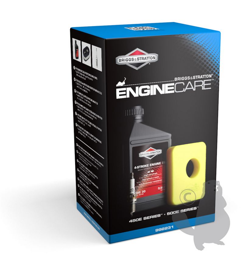 Maintenance kit for mowers with 450E, 500E BRIGGS & STRATTON engine. Contents: 1 bottle oil of 0,5 L, an air filter and a spark plug. ( Origineel: 992231 )