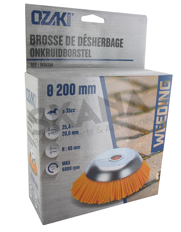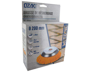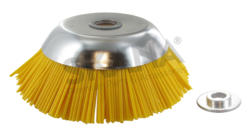 Conical brush suitable for brush cutters. External diameter 200 mm, central bore 25,4 mm. These conical brushes are a special tool and may not be operated at full speed.