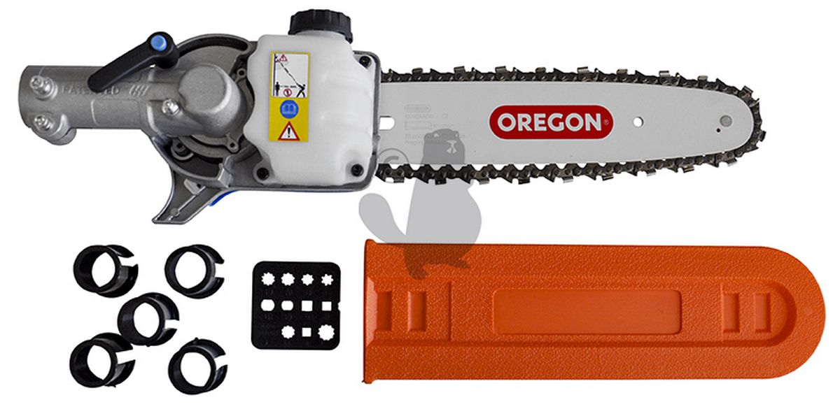 Universal hedge trimmer head. Designed to switch your brushcutter into a hedge trimmer. Adjustable tilt with 5 degrees of inclination (from 0 to 70 °). Includes 5 plastic rings for tube diameters of 24, 25, 25.4, 26 and 27 mm, and identification tag to identify the drive shaft. Equipped with a 10 "OREGON guidebar and 1/4" chain. Use our adapters 1602043 to 1602052 (not included).