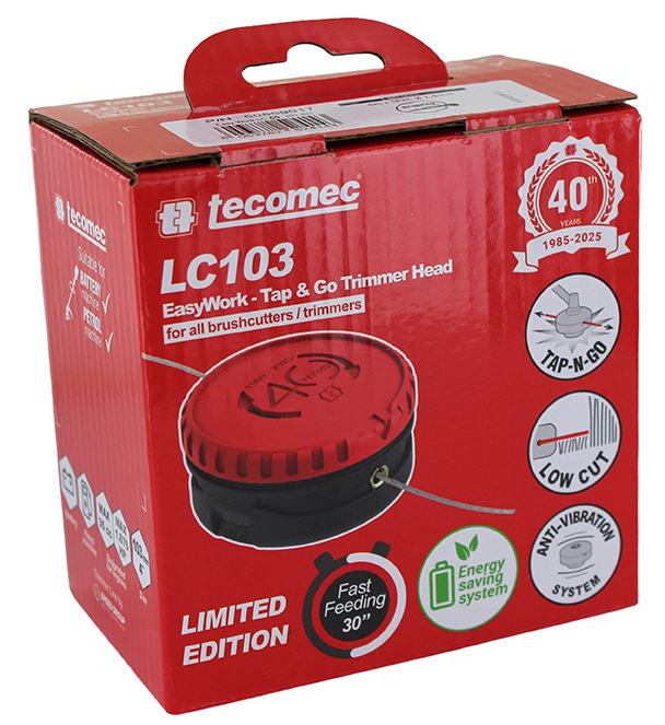 Universal 2-wire plastic multi-line head with a low profile. EasyWork quick loading system and Tap&Go operation. 103mm diameter. Compatible with wires from 2.0 to 3.5mm in diameter. Compatible with petrol (max 35cc) and electric (max 1076 hp) machines.