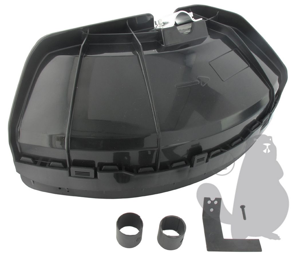 Universal blade guard with nylon line cutter for brushcutters. Standard for tube diameter of 28 mm and two plastic reducer rings for tube of 24 to 26 included.