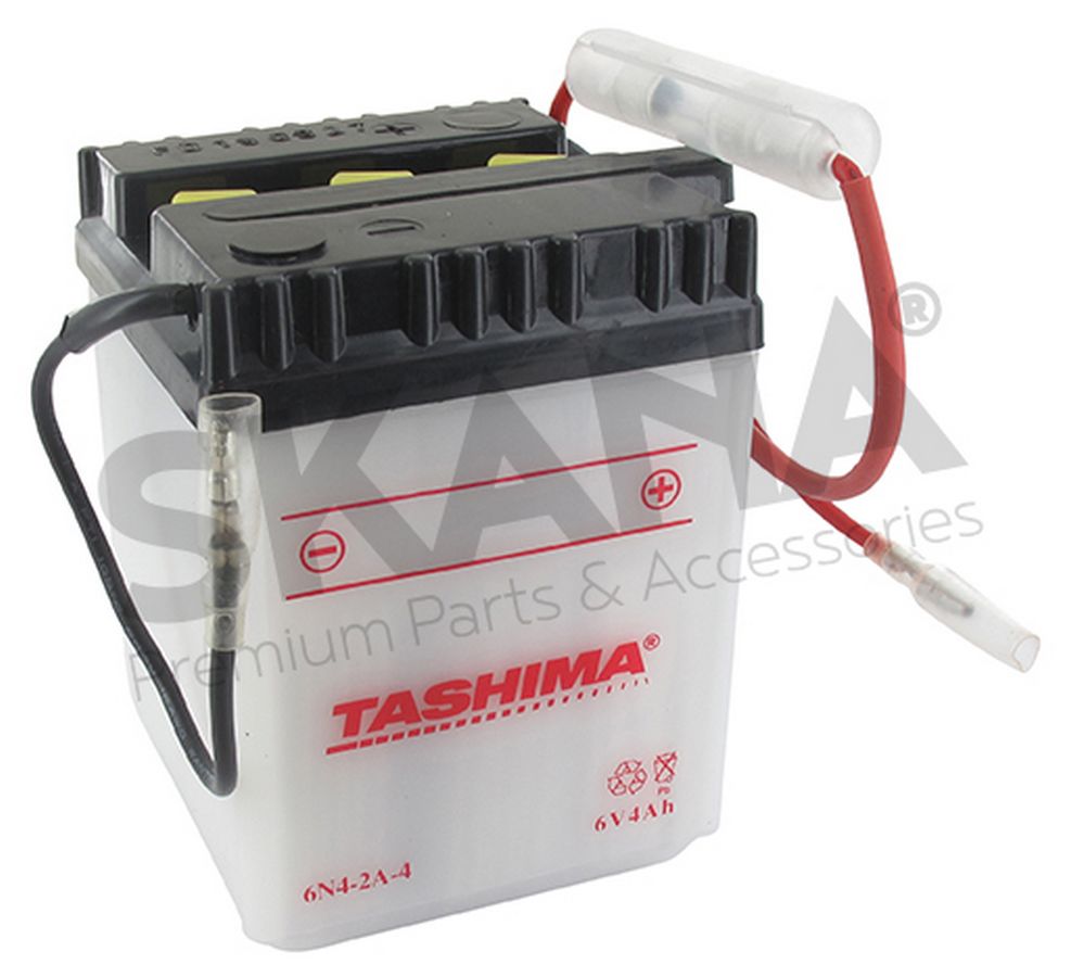 Battery 6V, 4A. L: 71, w: 71, H: 96mm, + right, for scooters, motorcycles. (delivered without acid).