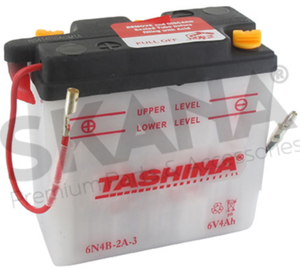 Battery 6V, 4A. L: 102, w: 48, H: 96mm, + links, for motorcycles. (delivered without acid).