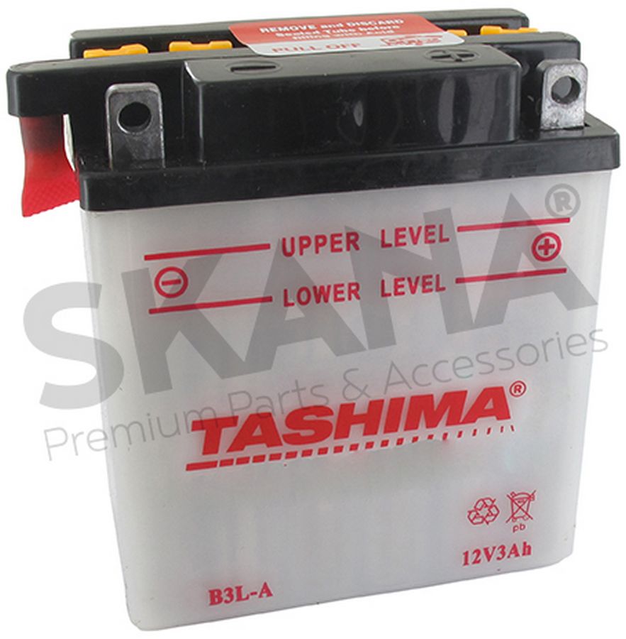 Battery 12V, 3A . L: 98, w: 56, H: 110mm, + right for motorcycles. (acid not included). The battery must be filled with battery acid and sealed before it is delivered to the user. The battery may not be sold to the private end-user with battery acid in separate packaging (Regulation 2019/1148).