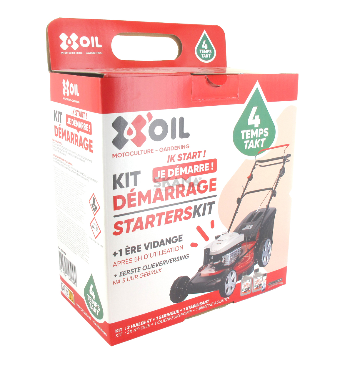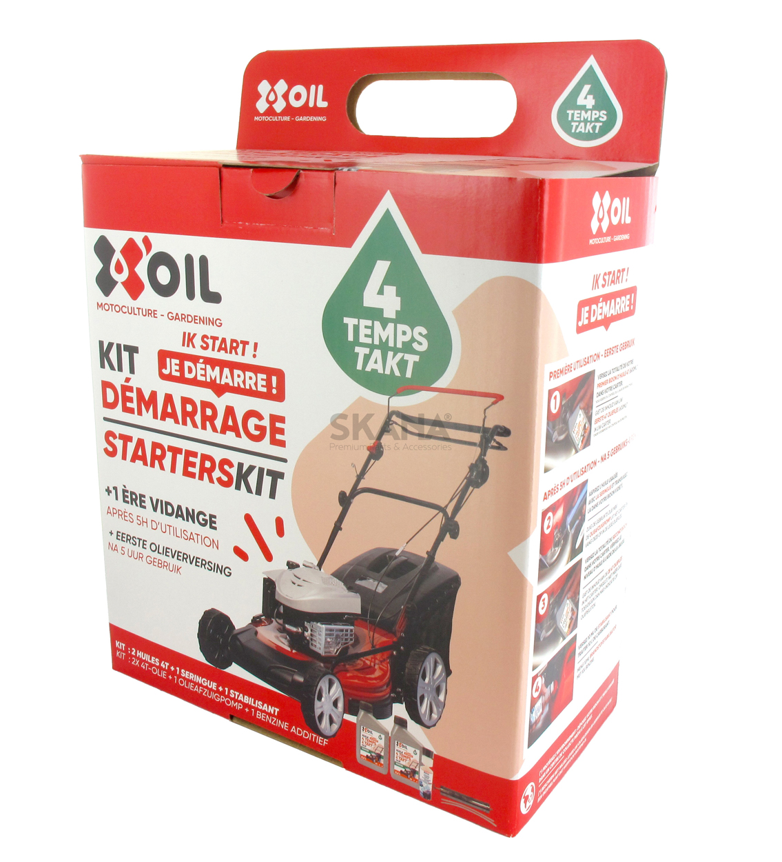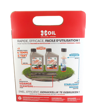 Kit de démarrage universel pour tondeuse, composé de: 1 seringue de vidange, 2 bidons d'huile 4 temps 0.6 l, 1 additif stabilisant carburant 250 ml