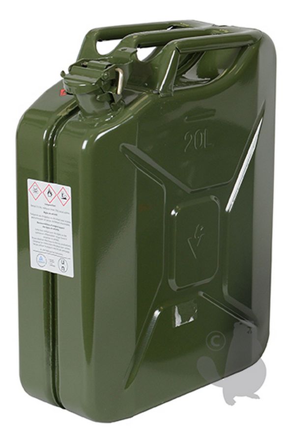 Jerrican métallique 20 litres. Peinture extérieure à la poudre couleur vert armée. Traitement intérieur antirouille et résistant à tout carburant. Système de verrouillage avec goupille de sécurité. Certifié UL et TUV.