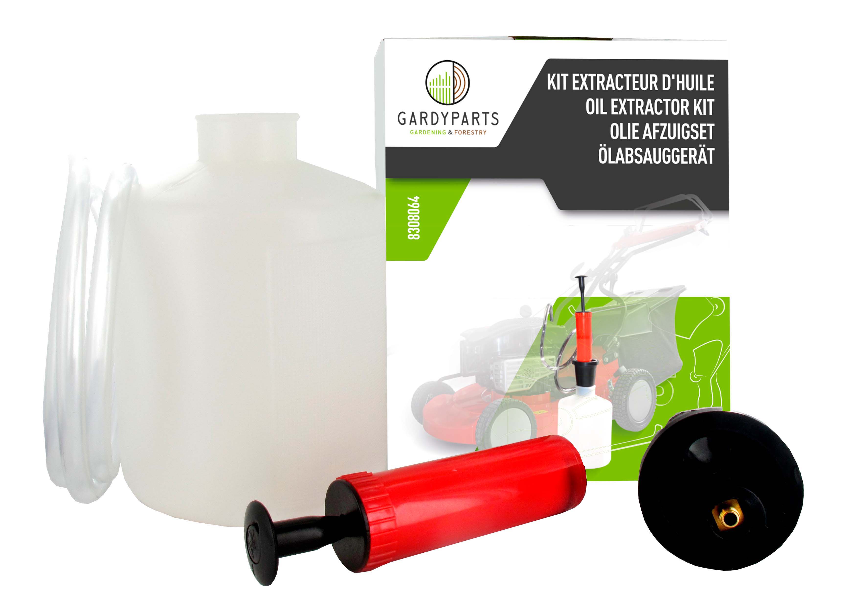 Kit de vidange - Livrée avec une pompe - 2 durites huile et essence, un récipient de récolte d’huile ou essence de 1,4 L - Un raccord 10 cm - Un adaptateur universel