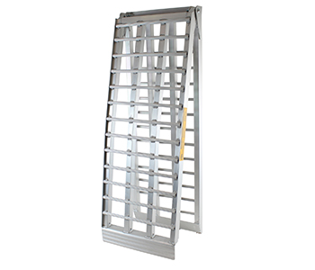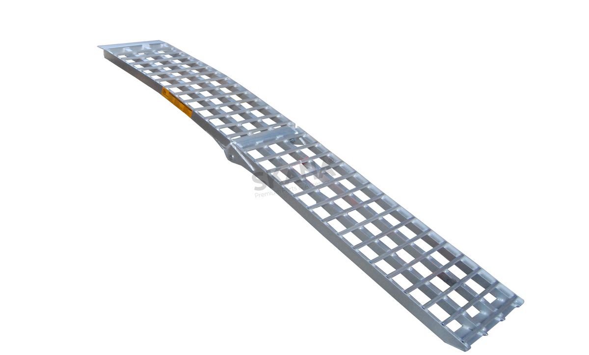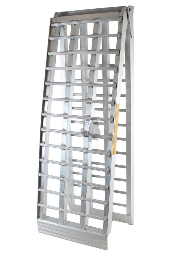 Rampe courbée pliable en alu L 244cm L: 43 cm, profil antidérapant d'une capacité maximum de 650kg/pièce. VENDU PAR PIECE.
