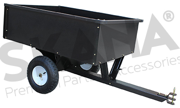 Remorque avec benne basculante d'une capacité de 180 kg. Porte arrière détachable. Dimensions du bac L: 96 x l: 71 x H: 30 cm. Pneus 13 x 400-6. Fixation du timon Ø 15 mm.