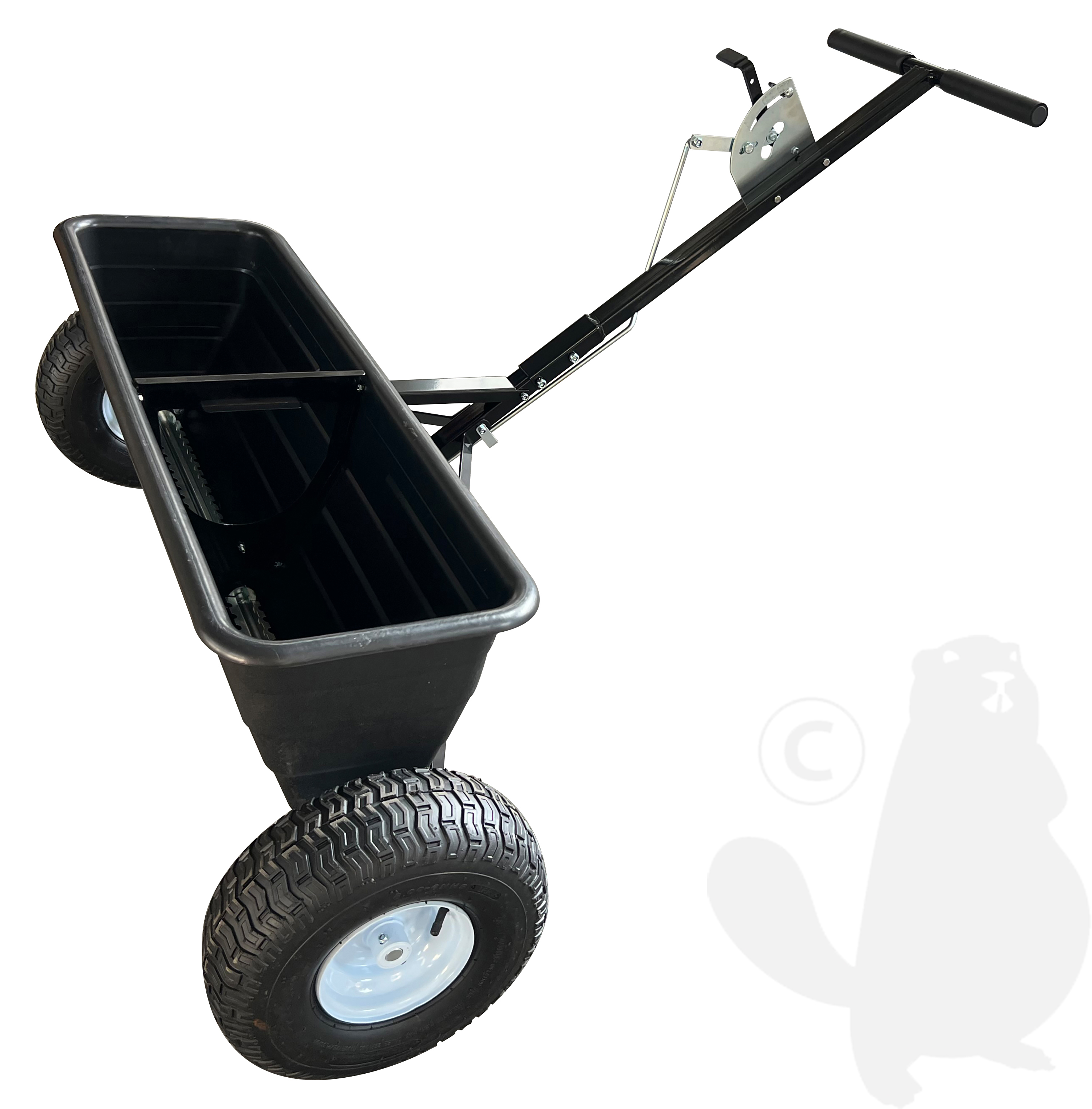Drop spreader - poly hopper - powder coated frame - rod flow control - 80 L / 79 Kg capacity - 101 cm spreading width - 14” pneumatic tires