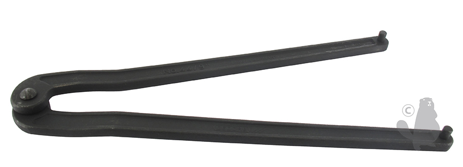 Clé à ergot réglable pour le démontage d'un embrayage du vilebrequin sur tronçonneuses et débrousailleuses.
