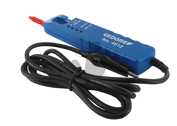 Détecteur de tension type "pique fil" GEDORE. Pour 3 à 48V. Indicateur par LED des plages de tension (12, 24 ou 48 V) et de la polarité. Protection IP40 / Classe de protection III.