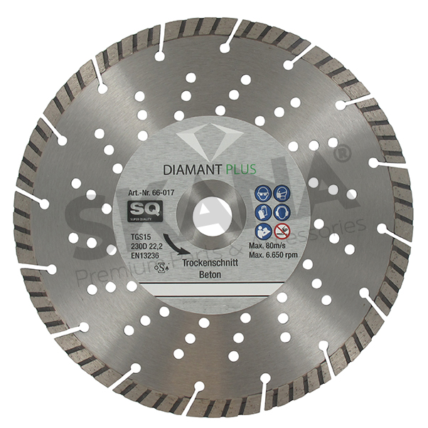 Disque diamant segmenté Ø230mm TURBO, segments (longueur x épaisseur) 7 x 2,5mm, alésage 22,2mm. Applications: béton, béton déactivé et granit.