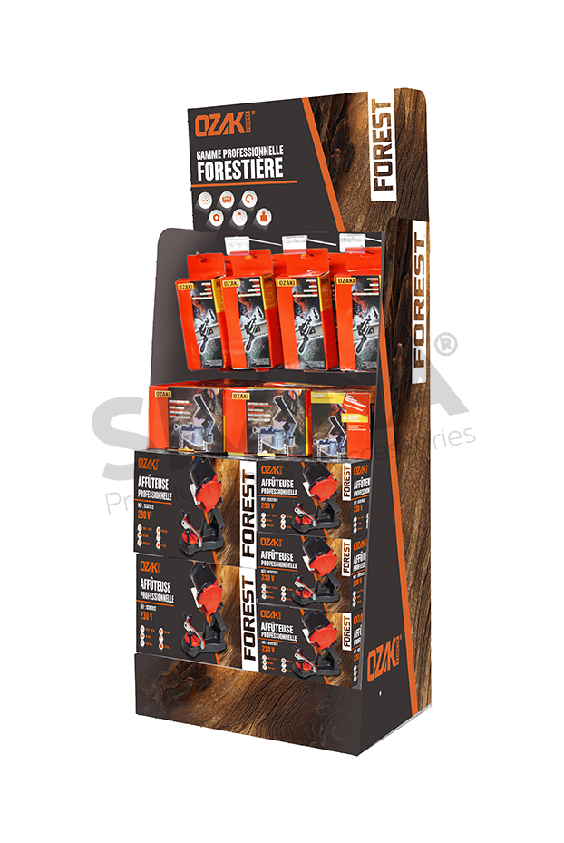 Présentoir affûteuses électriques et manuelles OZAKI®. Compostition: 7 x 9307812, 12 x 9302034, 5 x 9309323.