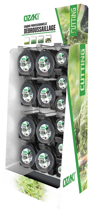 Présentoir avec assortiment de fil OZAKI helicoidal. Composition: 6 x 1512713, 6 x 1512714, 6 x 1512715, 6 x 1512716, 6 x 1512723, 6 x 1512724, 6 x 1512725, 6 x 1512726, 8 x 1512701, 8 x 1512702, 8 x 1512703, 8 x 1512704, 8 x 1512705.