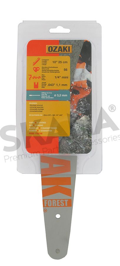 Guide OZAKI modèle ZKU25MINI + deux chaînes 1/4" .043 (1.1mm) 56 entraîneurs. Montage universel pour élagueurs guide 10" (25cm). Livré sous coque.