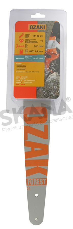 Guide OZAKI modèle ZKU35MINI + deux chaînes 1/4" .043 (1.1mm) 72 entraîneurs. Montage universel pour élagueurs guide 14" (35cm). Livré sous coque.