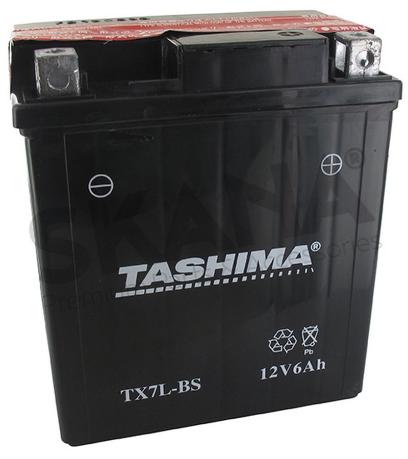 Batterie sans entretien 12V, 6A. L: 114, l: 71, H:131mm, + à droite pour scooter motos. (livrée avec acide séparé). Batterie à mettre en acide avant d'être délivrée à l'utilisateur. Ne peut être vendue au grand public avec acide séparé (Règlement 1907/2006).