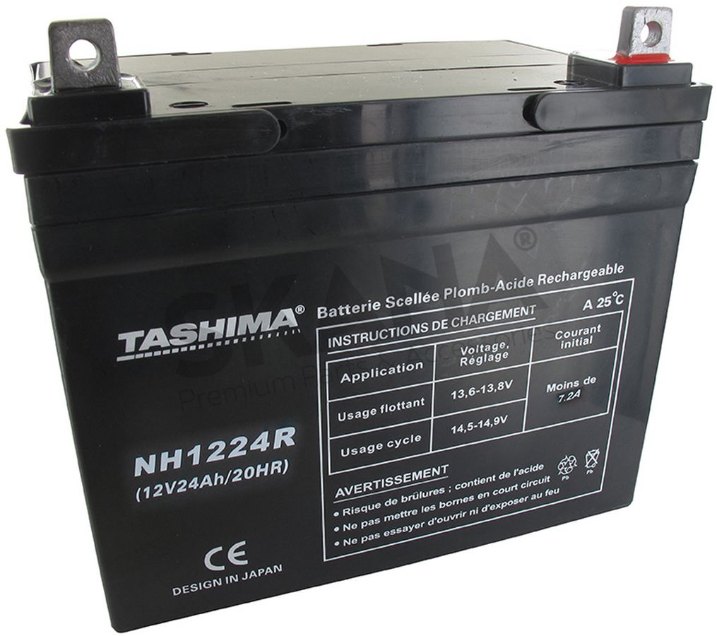 Batterie TASHIMA AGM 100% étanche 12V, 24A pour autoportée. L: 195, l: 130, h: 180, + à droite.