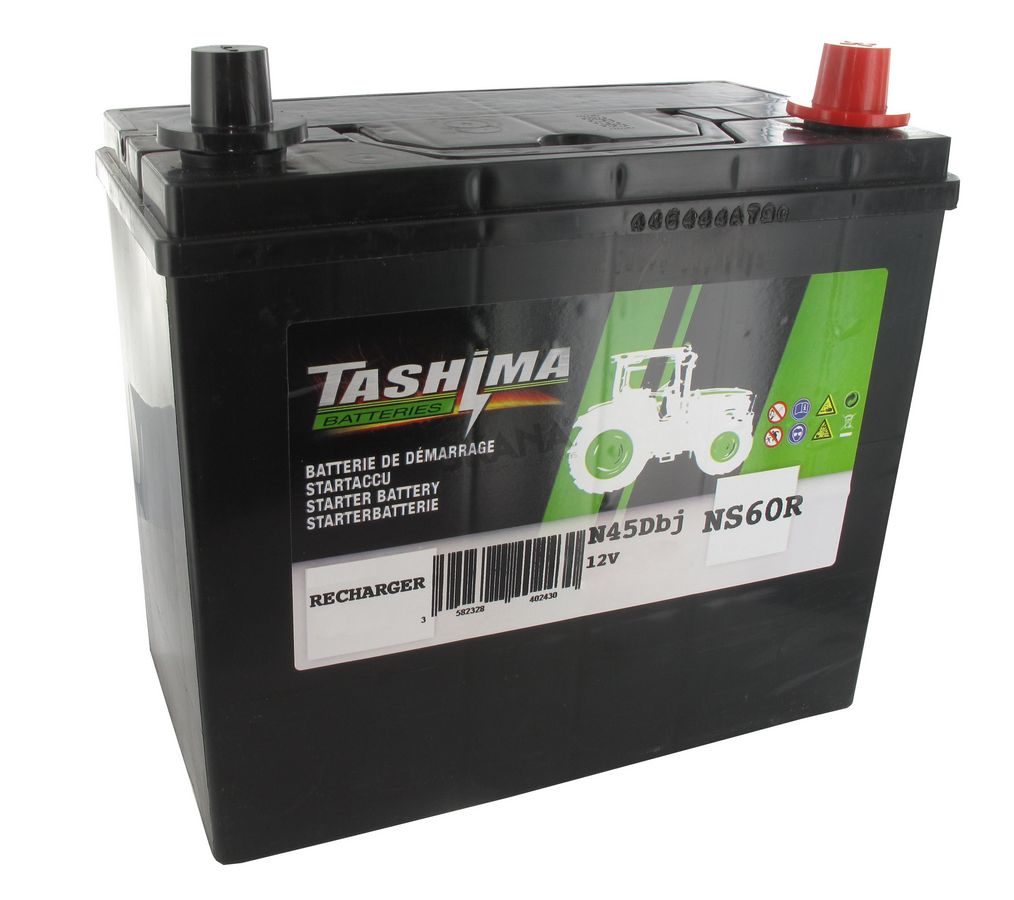 Batterie TASHIMA Pb Ca/Ca, sans entretien, pour tondeuse autoportée 12V, 45 Ah, + à droite. L: 235, l: 128, H:225mm, avec bornes étroites type japonaises. Compatibles pour batterie DIN 54523 avec adaptateurs de bornes. Puissance de démarrage de 300A. Adaptable pour KUBOTA modèles B1410- B1610- B1710- B2110- B2410- B2710- B1550- B1750- B1700- B2100- B2400- B6100- HST- B6200 et autres.