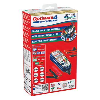 Chargeur de batterie OPTIMATE 4 QUAD, pour des batteries AGM, GEL & STD 12V de 4 à 60Ah & Batteries Lithium (LiFePO4) 12.8/13.2V de 2 à 15Ah - Courant de charge: 1,25 A - Désulphération intelligente: 0.5V - 14.4V.