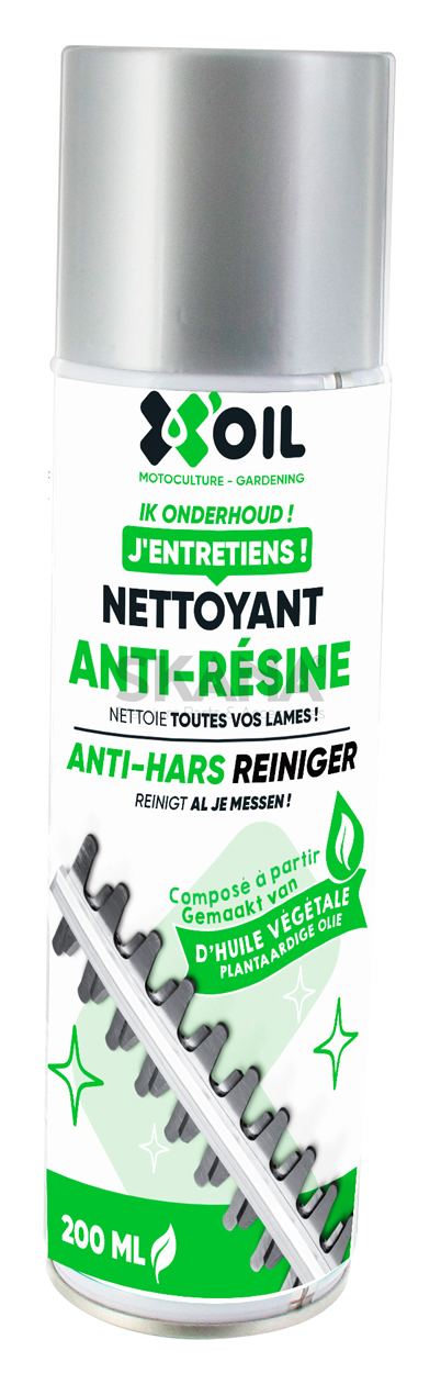 X'OIL antihars- en reinigingsspray met formule op basis van plantaardige olie, voor heggenscharen, snoeischaren. Spuitbus van 200 ml.