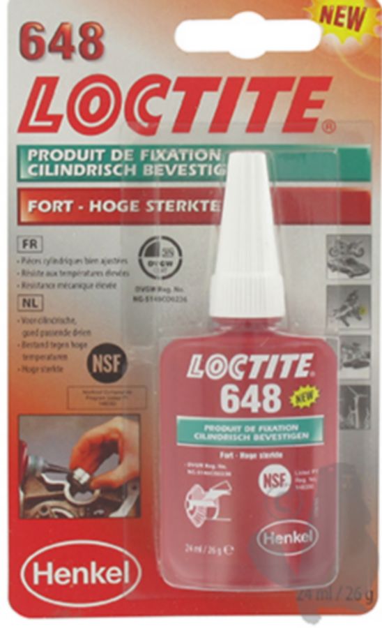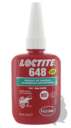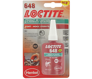 Bevestigings- /Borgmiddel 24 ml LOCTITE 648 - Aanbevolen voor het bevestigen van metalen delen met nauwkeurige passing, bv lagers, bussen, geleiders en afdichtringen,... Viscositeit: laag, vloeibaar. Temperatuurbereik: - 55 °C + 150 °C.