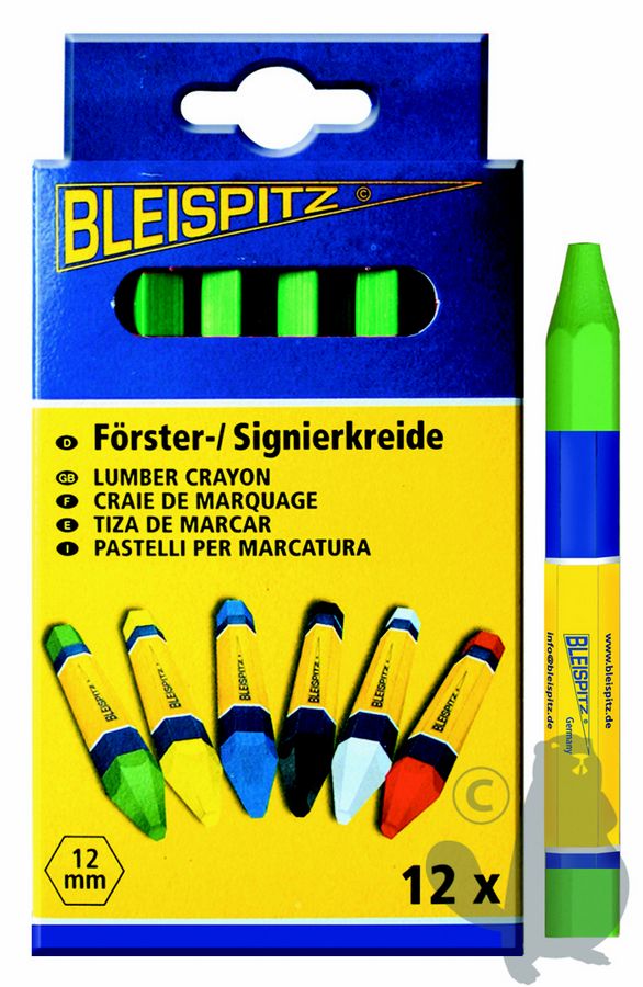 Doosje met 12 stuks bosbouwmarkeringskrijt - kleur groen. Voor droge of vochtige oppervlakten. Zeer weerbestendig. Zeskantig. 120x12mm.