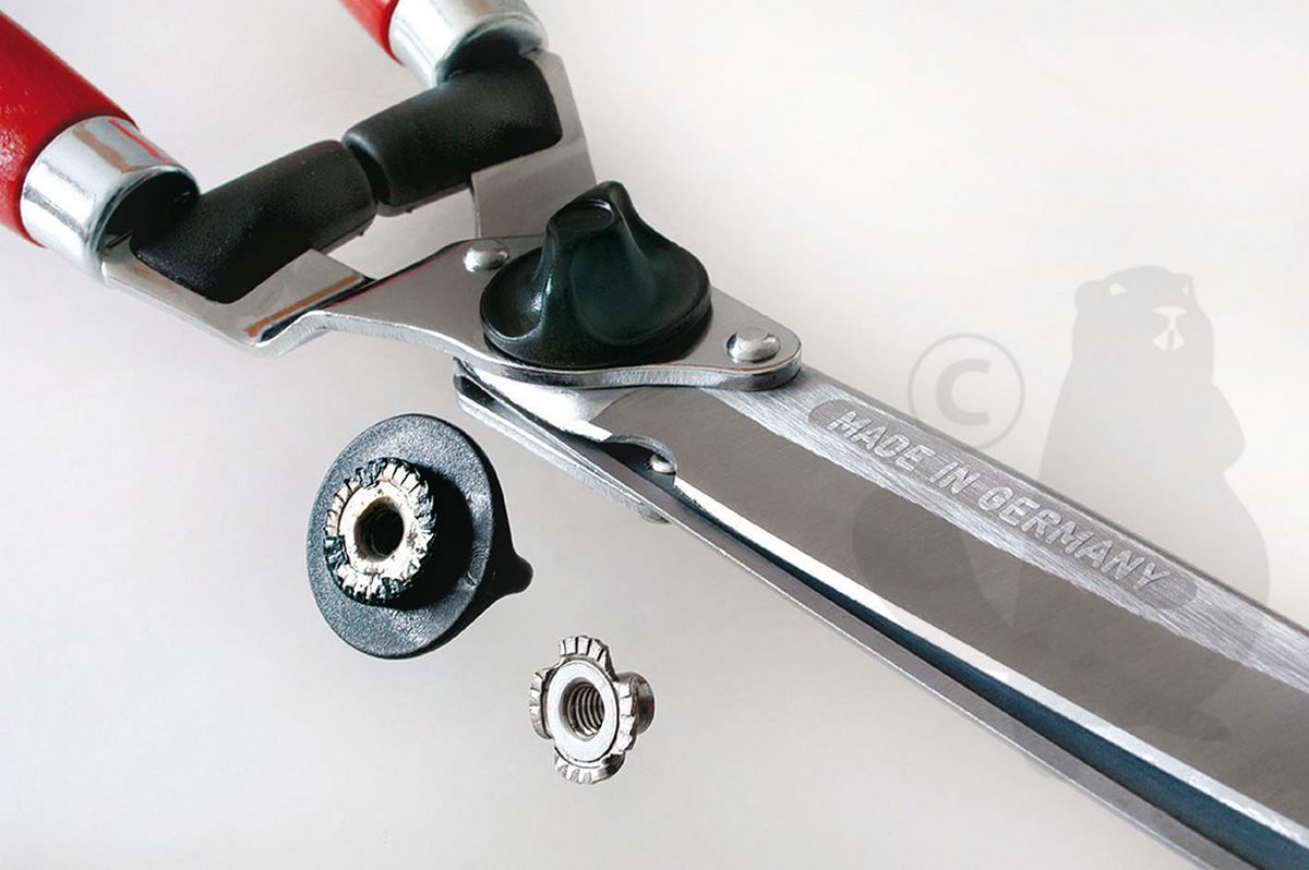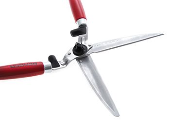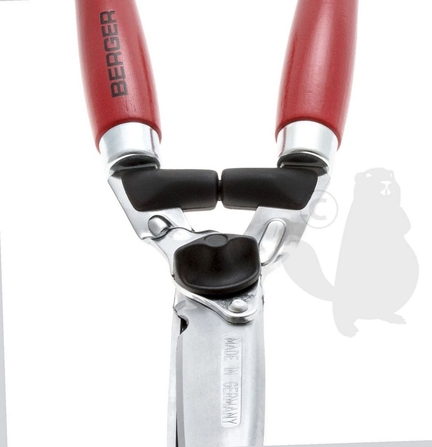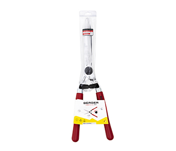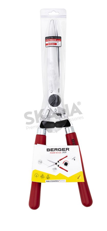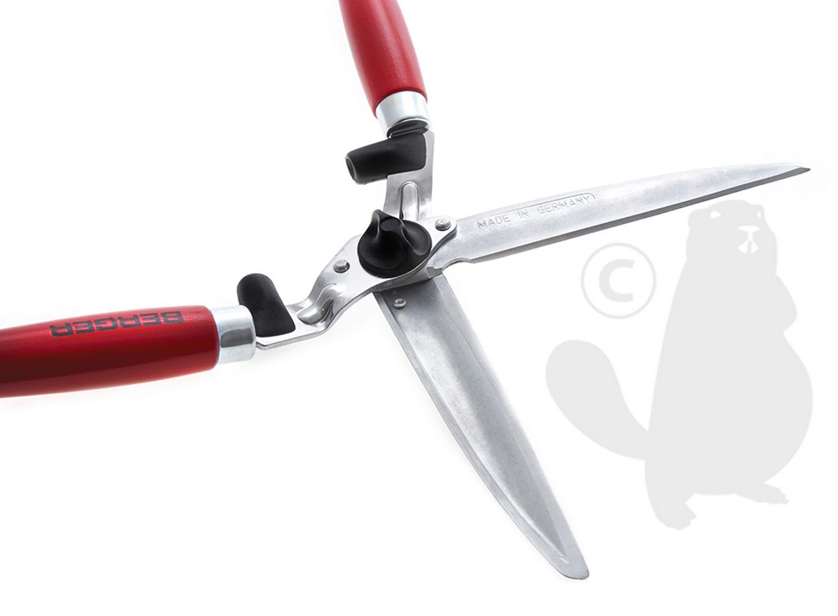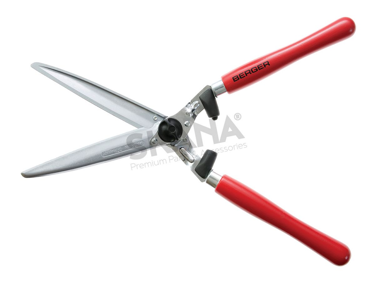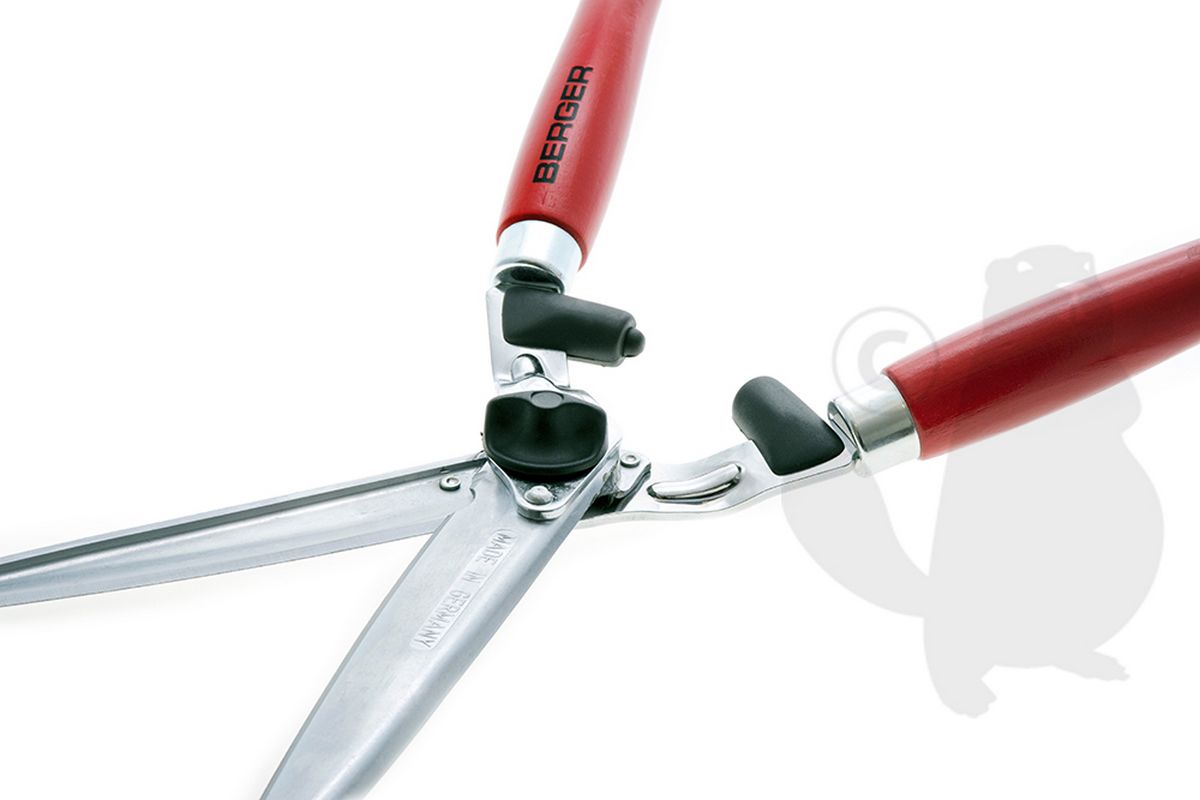 BERGER heggenschaar met rechte verchroomde messen en sapgroeven. Houten handvatten met schokdemper. Snijlengte: 235 mm.
