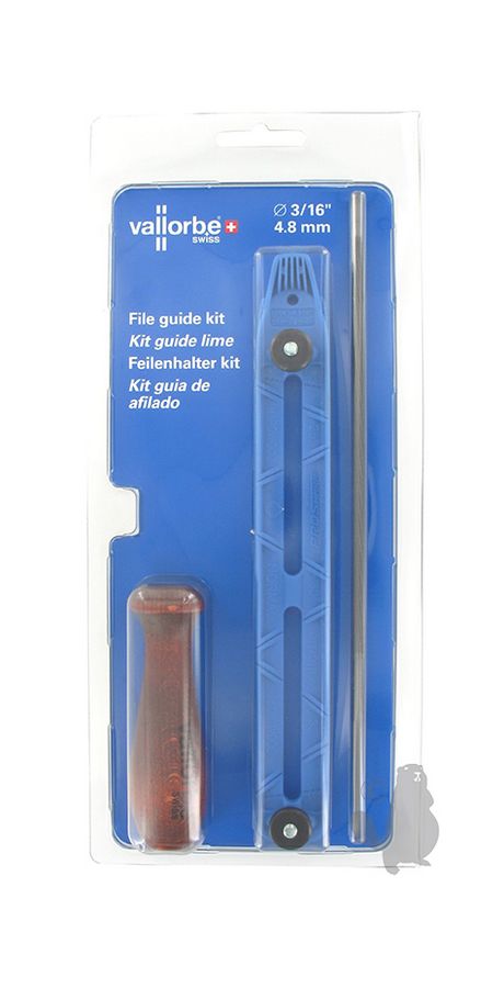 Blister VALLORBE met 1 ronde vijl Ø 3/16" (4,8 mm) voor zaagketting .325", een vijlhouder en een houten vijlhandvat.