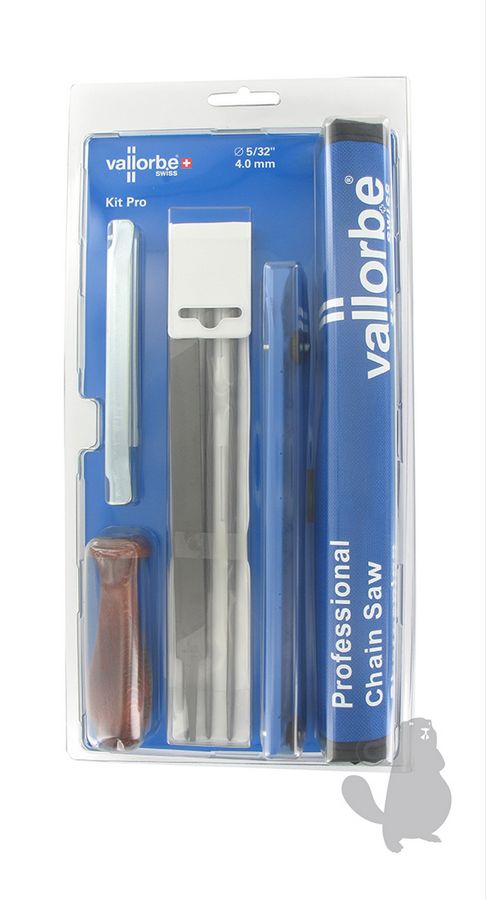 Blister VALLORBE met 3 ronde vijlen Ø 5/32" (4,0 mm) voor zaagketting 1/4" en 3/8" LP, een platte vijl, een vijlhouder, een handvat, een dieptesteller, een zaagbladgroefreiniger en een zakje.