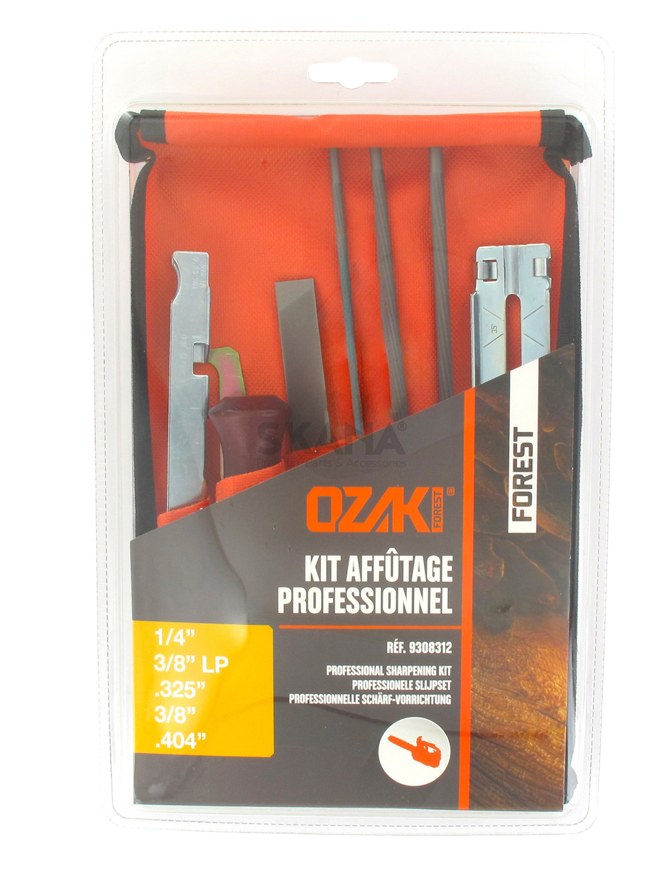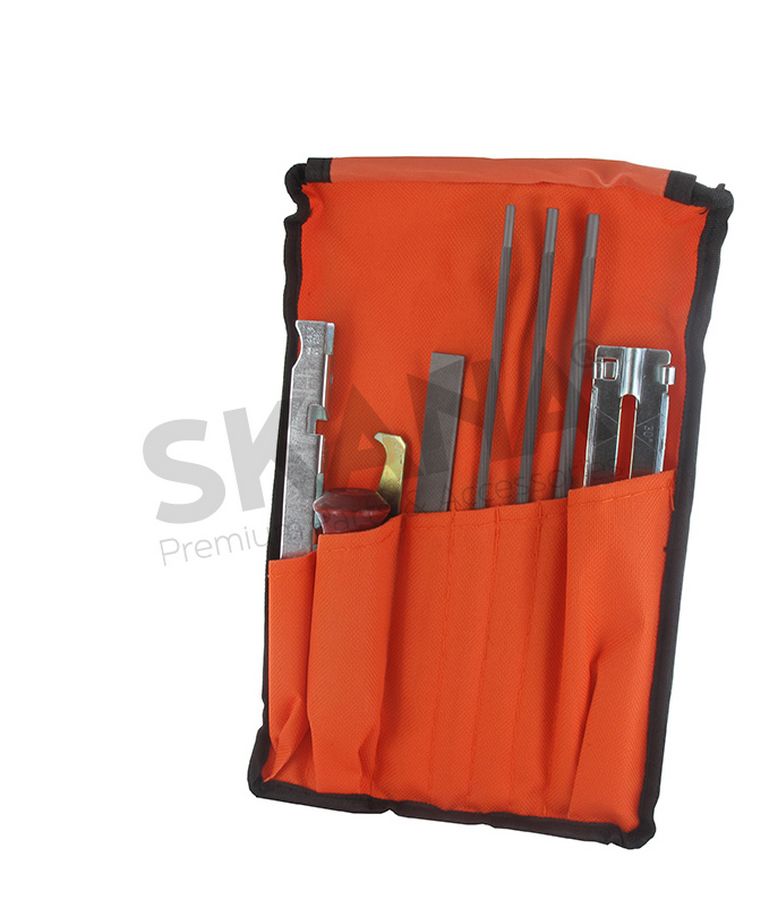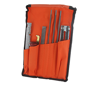 Vijlset, geleverd in een opbergzakje, geheel compleet met: 1 houten vijlhandvat, 1 dieptestellermaatje, 1 groefreiniger, 3 ronde vijlen Ø: 4 - 4,8 - en 5,5mm en 1 platte vijl. In blisterverpakking.