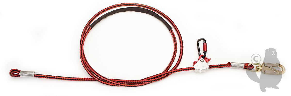 Veiligheidslijn in polyamide met stalen kern, lengte 4 m, diameter van 10 mm, EN358. Gesmede haakopening 19 mm EN362, lijnklem en aluminium karabijnhaak met opening 21 mm EN362.