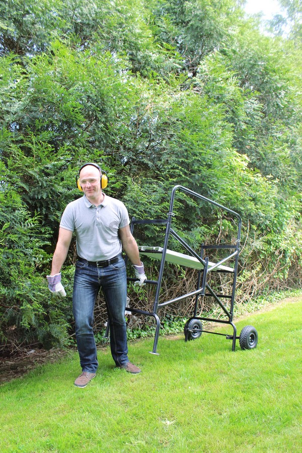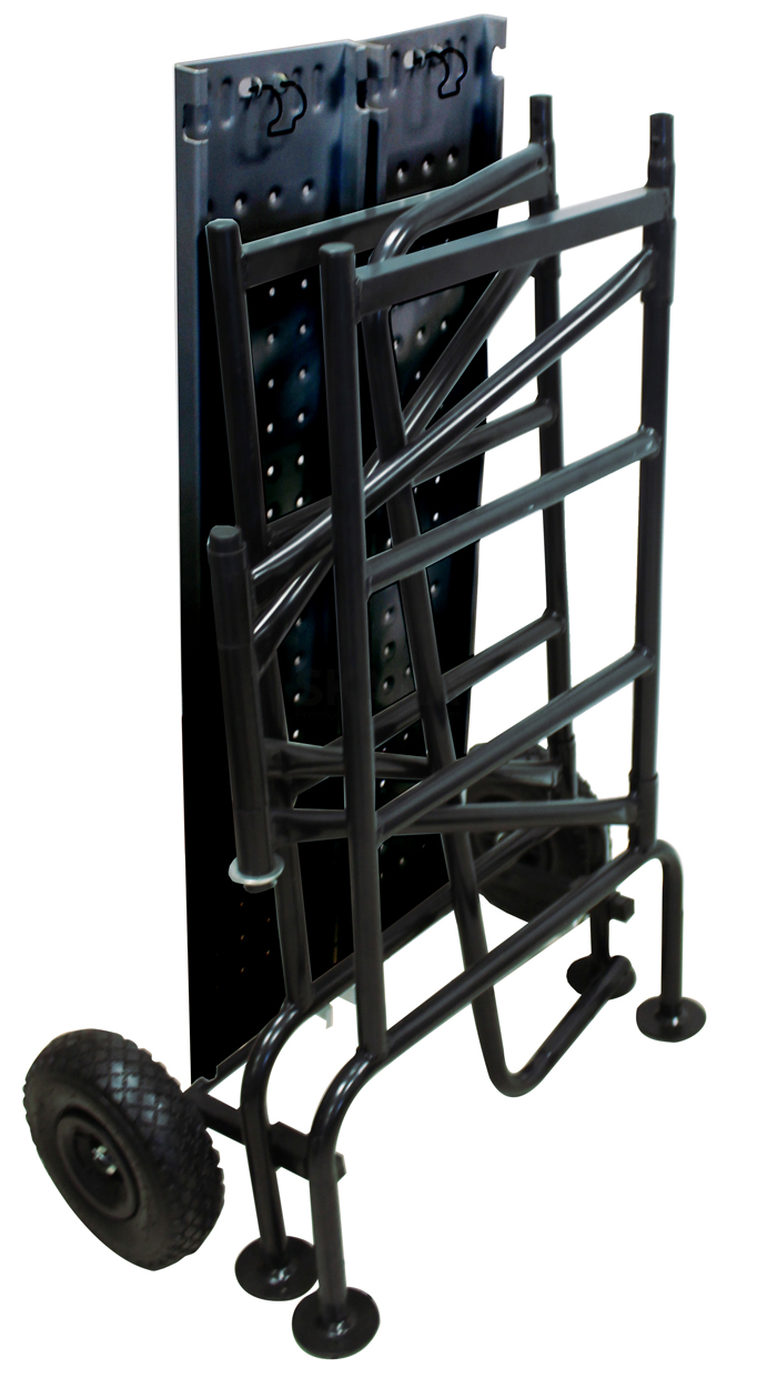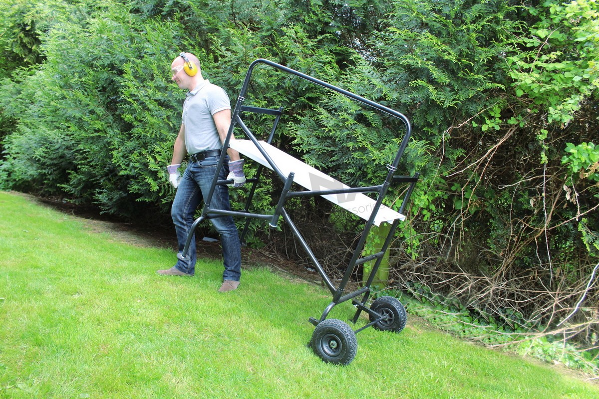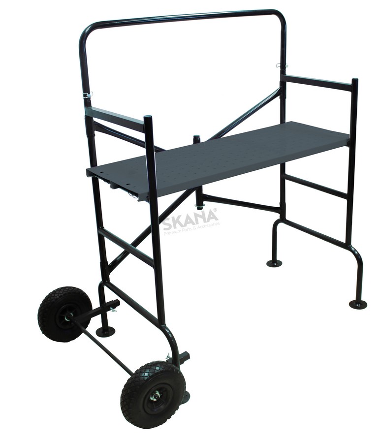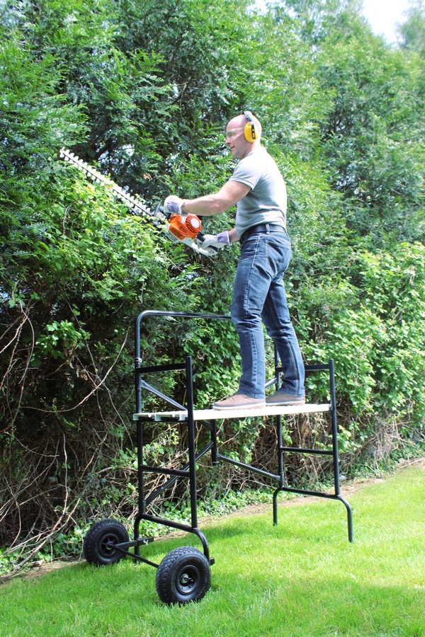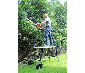 Steiger met 3 werkniveau's (32, 56 en 81 cm van het grondniveau) met reling. Opvouwbaar model met transportwiel. Opvouwbaar model met transportwiel. Maximale belasting: 150 kg. Afmeting werkblad in twee delen en antislip: 107 x 40 cm. Voor buiten- en vast gebruik. Huishoudelijk gebruik en voldoet aan EN 85-200.